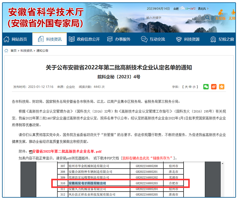 根據(jù)《高新技術(shù)企業(yè)認(rèn)定管理辦法》和《高新技術(shù)企業(yè)認(rèn)定管理工作指引》有關(guān)規(guī)定,我司已于2023年1月12日在安徽省認(rèn)定機(jī)構(gòu)2022年第二批高新技術(shù)企業(yè)認(rèn)證備案公示名錄內(nèi),現(xiàn)已公式完畢。