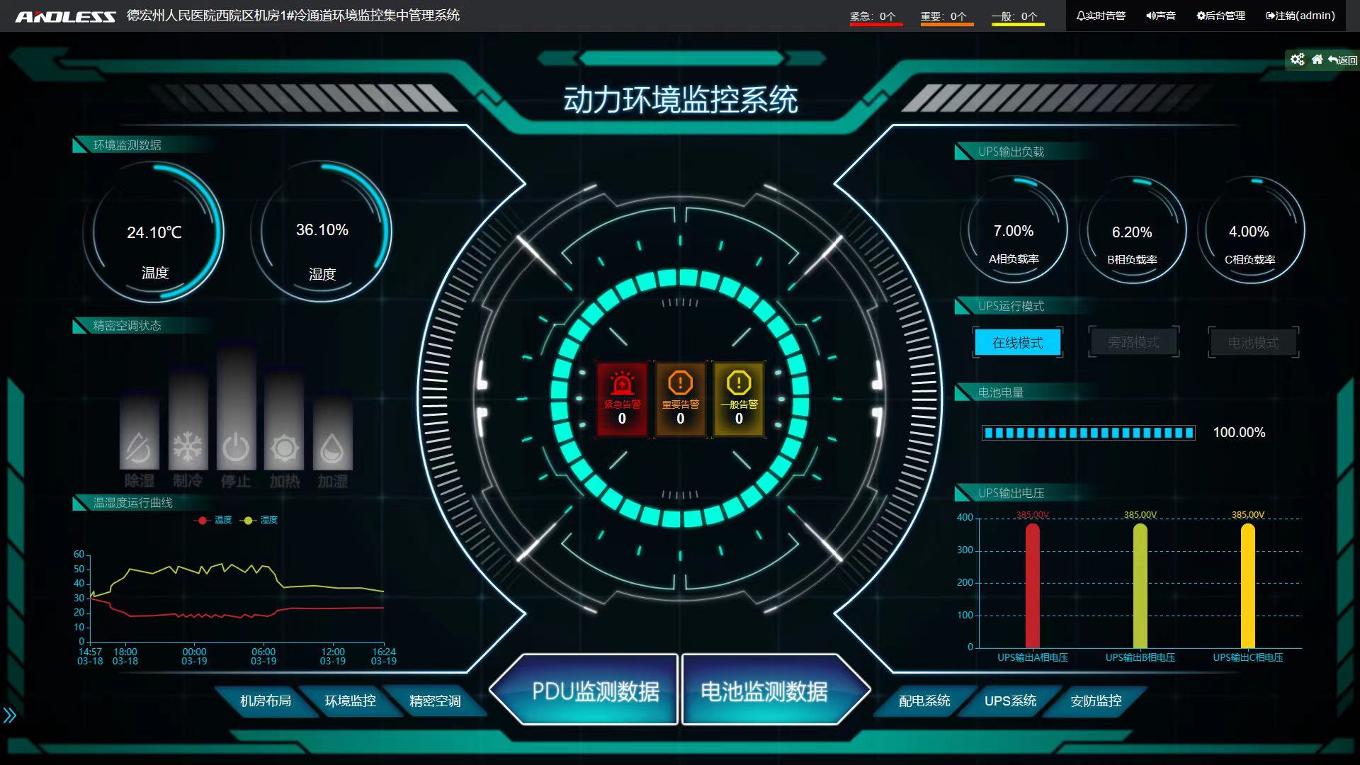 安德力士公司為德宏州醫(yī)院信息化建設(shè)提供支持,為貴院數(shù)據(jù)機(jī)房建設(shè)2套GLM微模塊機(jī)房系統(tǒng),包含UPS不間斷電源系統(tǒng)、精密空調(diào)系統(tǒng)、環(huán)境檢測系統(tǒng)、配電系統(tǒng)、PDU監(jiān)測系統(tǒng)以及一套環(huán)境監(jiān)控集中管理系統(tǒng),設(shè)備現(xiàn)已安裝調(diào)試完成。貴院機(jī)房建設(shè)使用4套UPS電源系統(tǒng),2套UPS電源為數(shù)據(jù)中心機(jī)房IT設(shè)備提供后備電源保障,2套為醫(yī)院大樓弱電井系統(tǒng)提供后備保障。機(jī)房使用9臺行間空調(diào),2臺房間級基站空調(diào),11臺空調(diào)為機(jī)房提供一個恒溫恒濕的良好運(yùn)行環(huán)境。